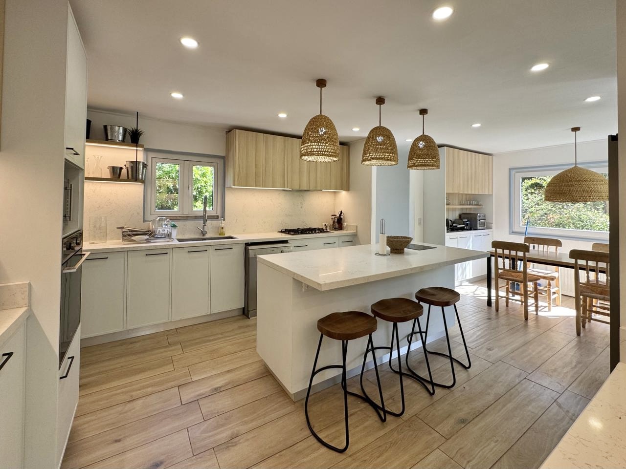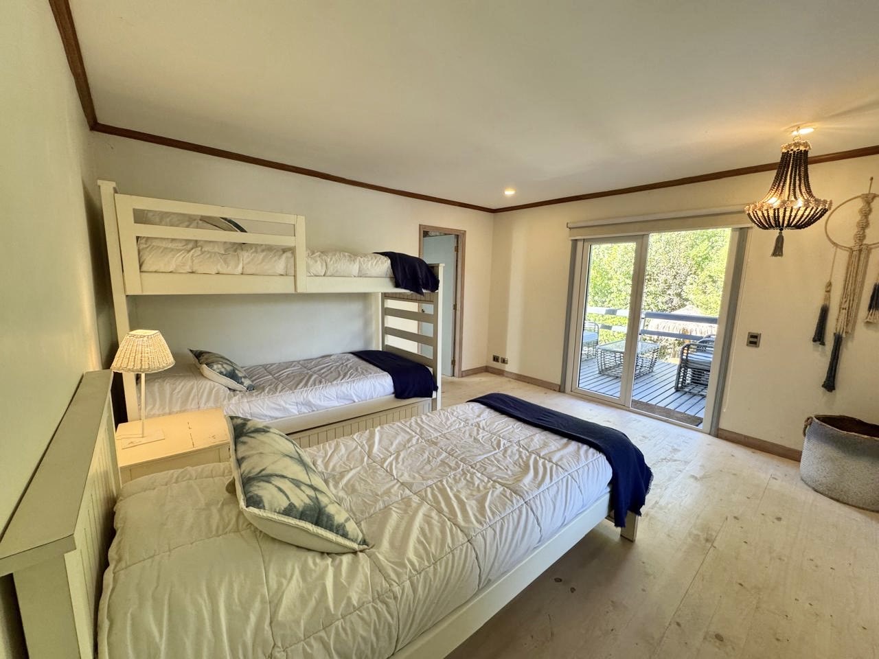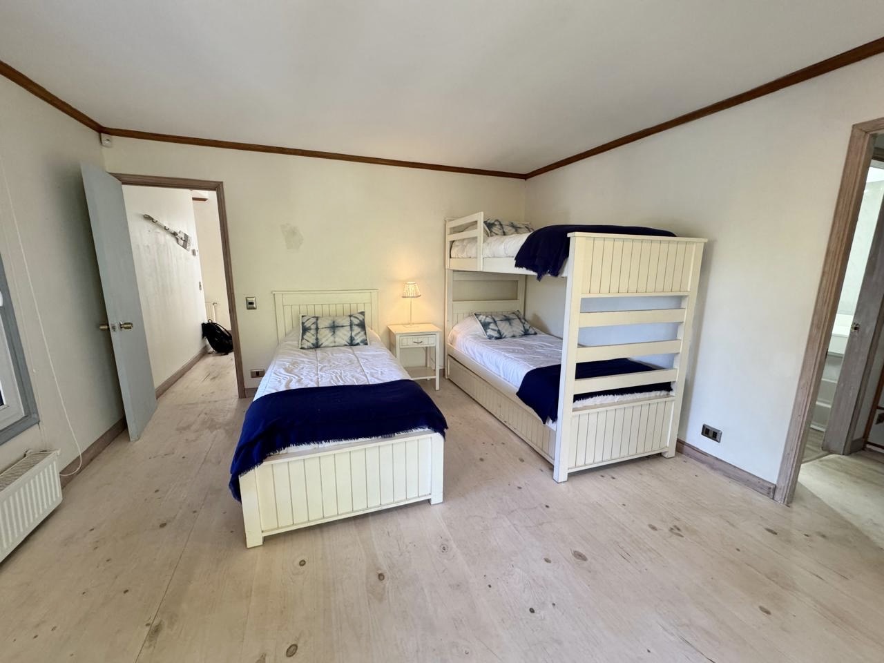 5 dormitorios y 5 baños, más baño de visitas y pieza y baño de servicio. El área principal incluye living–comedor con chimenea, además de una acogedora sala de estar con bosca. La cocina se encuentra remodelada y cuenta con comedor de diario.