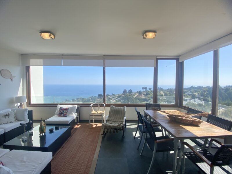 145 m2 terrazas, linda vista al mar, amoblado, living comedor, chimenea, terrazas, 4 dormitorios, 3 baños, calefacción, 2 estacionamientos, bodega, piscina, tenis